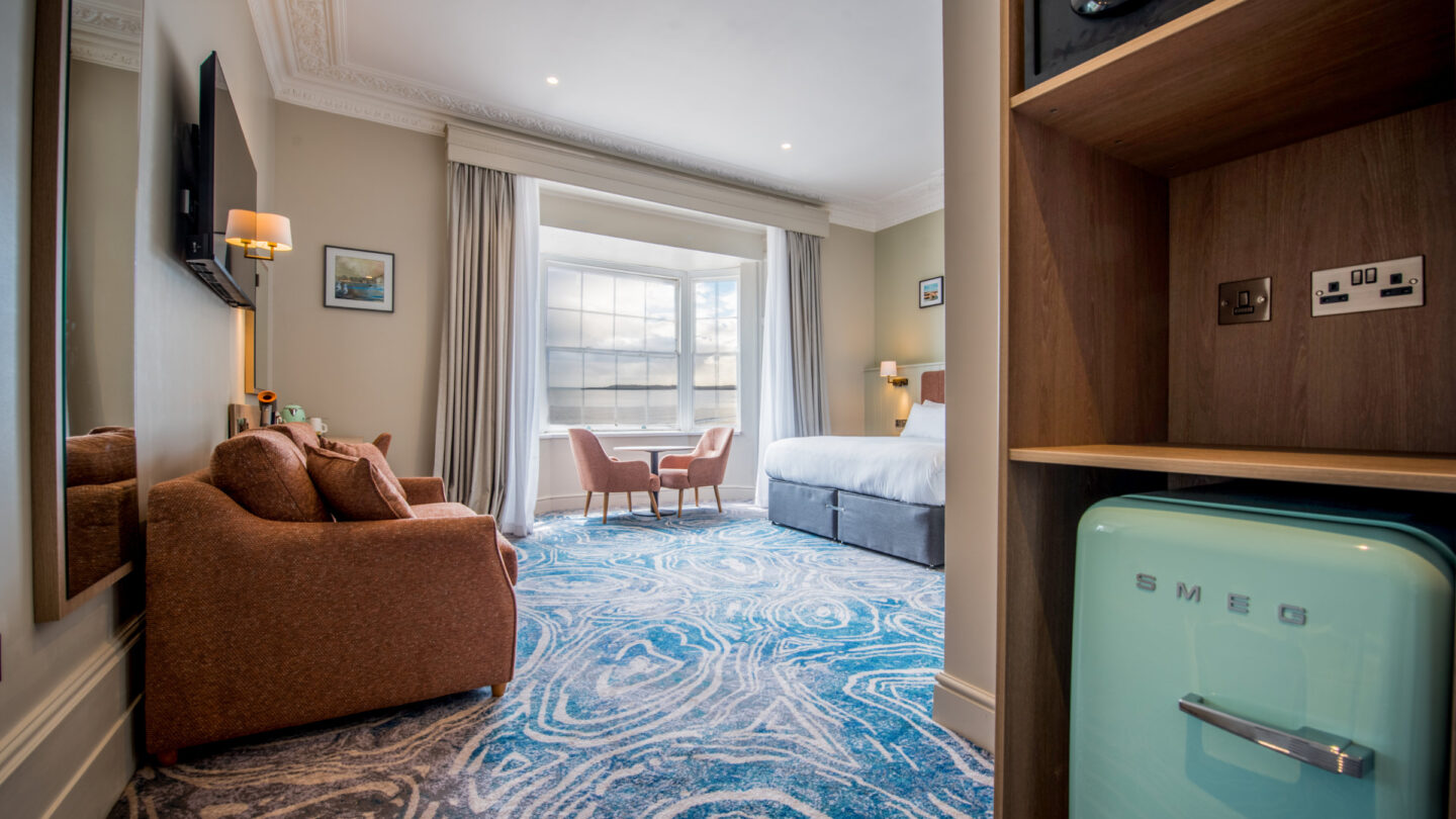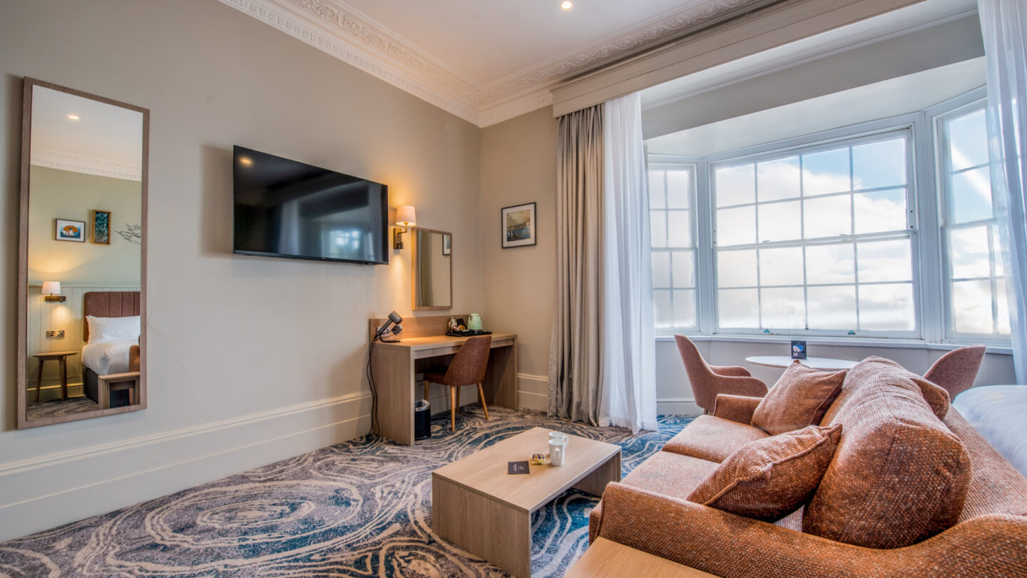 Luxury redefined in our spacious Junior Suite, enjoyed this short break with breakfast included at no additional cost to our flex rates. Pre-pay non-refundable rate. Amenities; Sea view from seating area with sofa, air-con, Smeg kettle & fridge, Dyson hairdryer, Hansgrohe shower and separate bathtub.